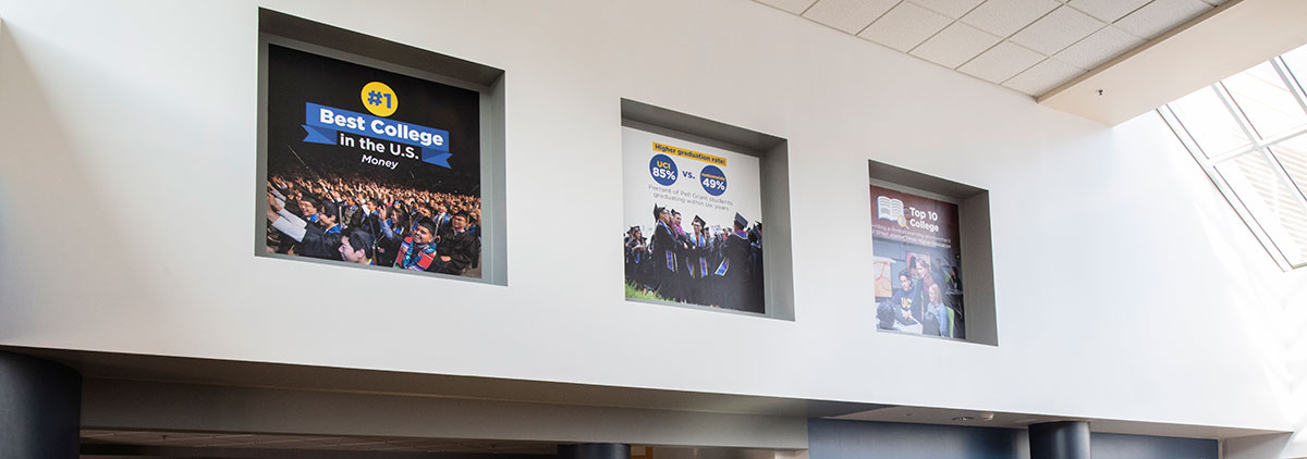 In addition, above on the walls near the Terrace Lounge are decals that list accolades UCI has accumulated in its goal to pave the way toward a brighter future.