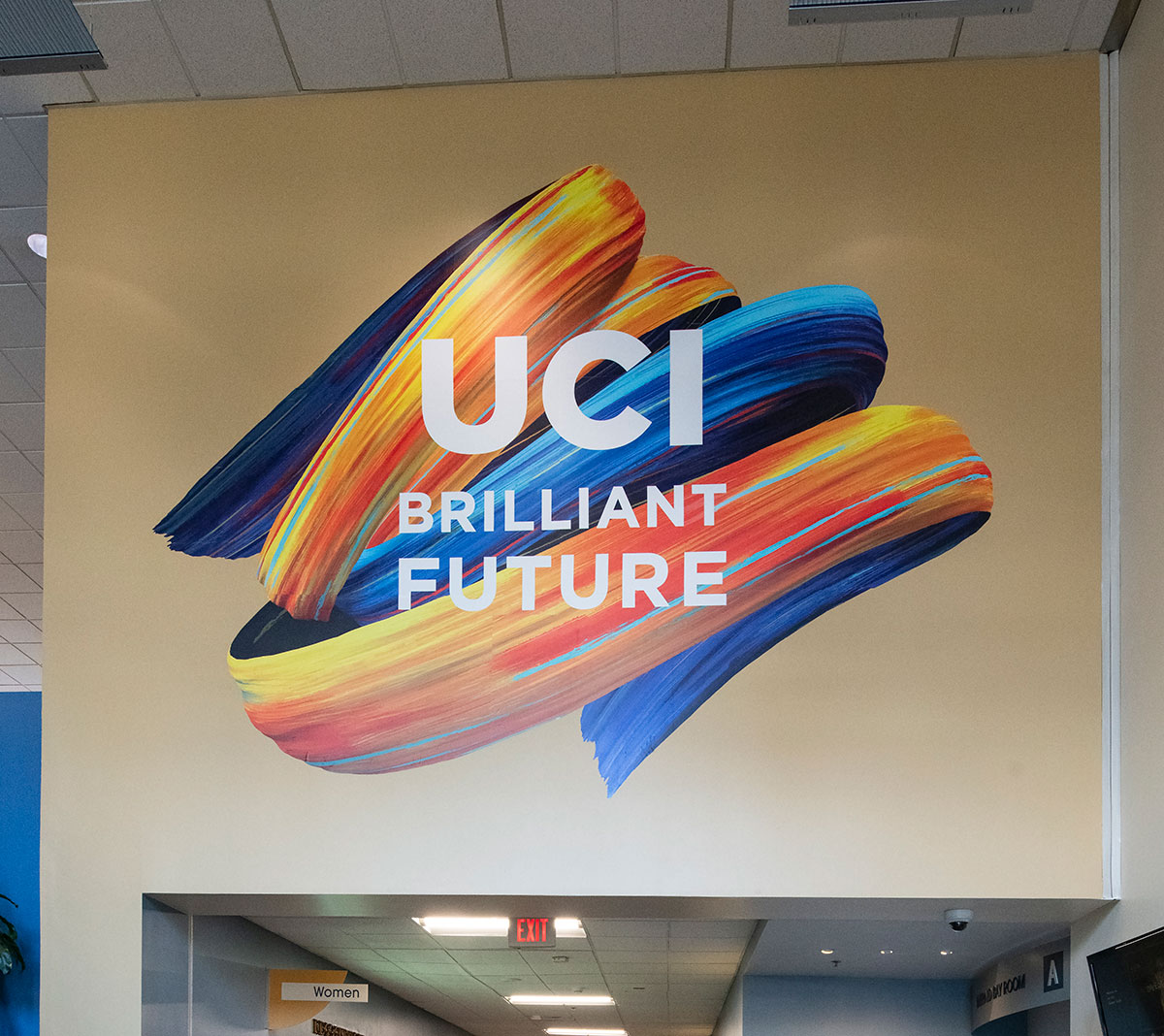 One decal appears at the entrance of the Student Center. Like fresh paint on a canvas, it reads “UCI Brilliant Future” surrounded in swirling brushstrokes of orange, blue, and gold.
