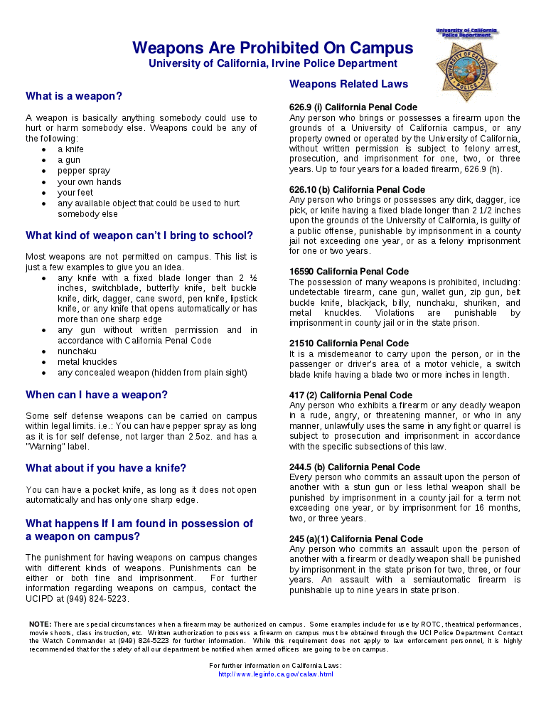 In accordance with California Penal Code, most weapons are not permitted on University property. See UCI Police Department’s Guide for details. To request permission to use weapons (or weapon-like objects) at an event, clients must submit their request to University more than 15 days prior to the event start for review.